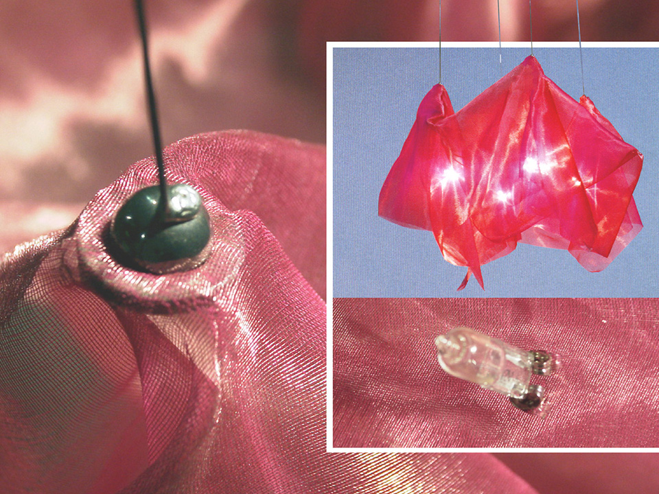 The classical crafted chandelier, interpreted from an industrial point of view. Chandelier M2 is based on the repetition of form, not around a center but in a line. The silk fabric functions as the current conductor, light radiator (reflector) and decoration. The 12V halogen lamps can be pinned on the fabric randomly.
